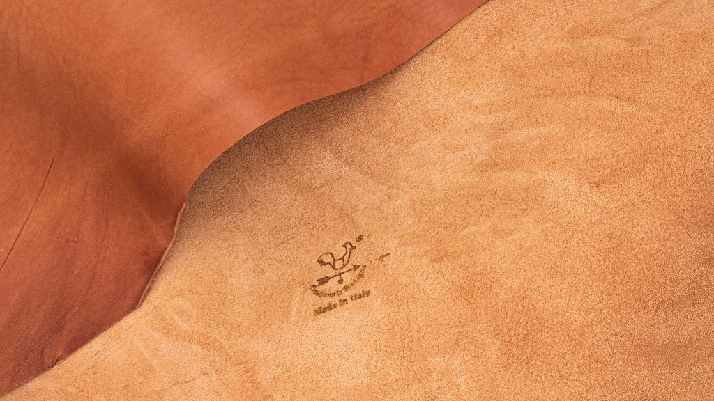 Dieses wunderschöne, matte Vachetta-Rindsleder wird auf besondere Weise in Eichenfässern mit Wurzeln, Baumrinde und Kastanienextrakten gegerbt. Die pflanzlichen und tierischen Fette verleihen dem Leder während des Prozesses sein einzigartiges Aussehen und seine Weichheit. Die Schultern sind unbehandelt und haben eine natürliche Narbung. Es ist erstklassige Qualität direkt aus Bella Italia und fühlt sich angenehm wachsig an!