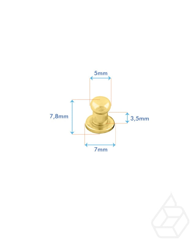Beiltaschenknopf / Knopfniete mit goldener und silberner Beschichtung und einer Kopfgröße von 5 mm. Ideal für Ihre selbst entworfene Tasche oder Lederaccessoires. Dies ist einer der hochwertigsten Beiltaschenknöpfe aus unserem Sortiment an Lederbeschlägen aus Italien.