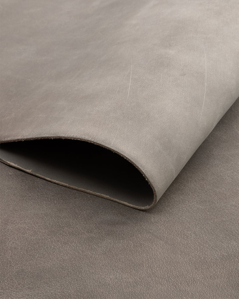 La tonalità grigio caldo offre un'estetica contemporanea e versatile, rendendola una scelta eccezionale sia per design classici che moderni. Con la sua consistenza rigida e la grana naturale, questa pelle è tanto durevole quanto elegante e si evolverà sottilmente in carattere con l'utilizzo.