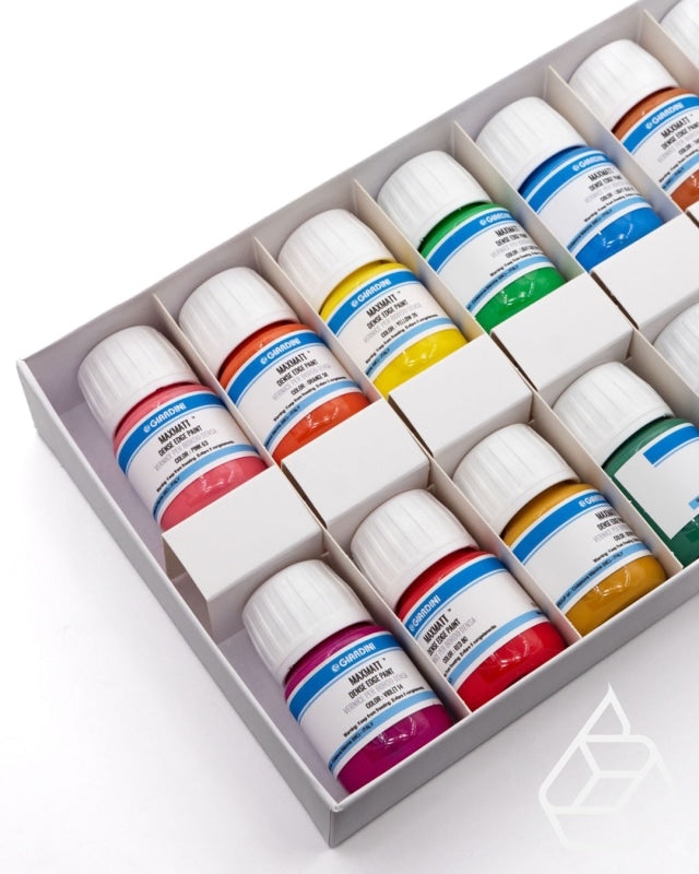 Deze Basic Edge Paint set bevat 30 ml verpakkingen kantenverf in 18 kleuren: White 10, Black 11, Beige 18, Grey 77, Brown 24, Dark Brown 36, Tan 69, Light Brown 59, Light Blue 45, Blue 61, Light Green 90, Green 49, Yellow 26, Ochre 85, Orange 58, Red 80, Pink 62, Violet 14.